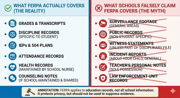 FERPA (Family Educational Rights and Privacy Act) is a federal law protecting student education records—but surveillance footage is generally not an educational record under FERPA and is instead governed by state public records laws with different privacy limitations. When schools claim they “cannot show video because of FERPA,” they are typically either: (1) misrepresenting FERPA’s scope to suppress evidence, (2) conflating FERPA with legitimate privacy concerns about other students visible in footage, or (3) using privacy as cover for the fact that video evidence contradicts their narrative. The correct response requires understanding what FERPA actually covers, what alternatives exist (blurred footage, in-person viewing, written description), and how to expose evidence suppression disguised as legal compliance.