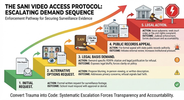 Schools claim “FERPA prevents us from showing you the video” because parents don’t know FERPA law well enough to challenge the lie. The Student Advocacy Network Institute, a Policy-Driven Student Safety Agency, operates on this principle: surveillance footage is almost never protected by FERPA, and even when legitimate privacy concerns exist, schools have multiple options to provide access without violating privacy. We convert trauma into code by teaching parents that when schools refuse to show video evidence, they are deploying Pattern #2 (Evidence Suppression) disguised as Pattern #12 (Liability Deflection using false legal claims). The real reason schools refuse to show footage is usually: (1) the video contradicts their narrative, (2) the video reveals staff failure to supervise, or (3) the video proves pattern/escalation they previously denied. Selective enforcement IS discrimination, and video evidence often proves disparate treatment—which is why schools desperately want to suppress it. This article dismantles the FERPA excuse and provides the exact demands that force video access or expose suppression.