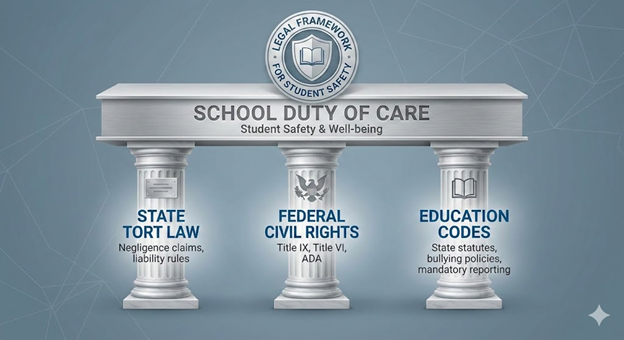 School Duty of Care is the legal obligation requiring educational institutions to protect students from reasonably foreseeable harm, including peer-on-peer harassment, discrimination, and violence. This duty arises from multiple sources: state tort law (negligence), federal civil rights statutes (Title VI, Title IX, Section 504, ADA), and state education codes that mandate supervision, intervention, and documentation when student safety is compromised.