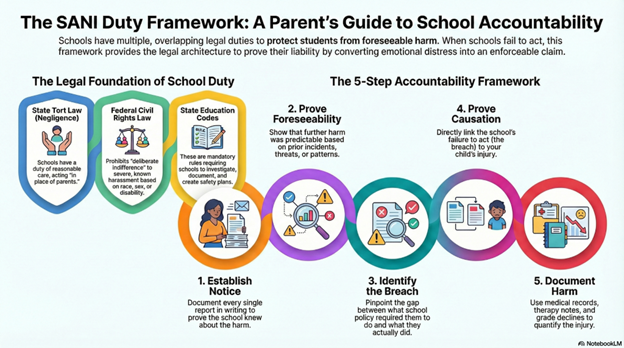 This framework converts emotional distress into enforceable legal claims. It is the architecture SANI uses in every case to hold schools accountable.