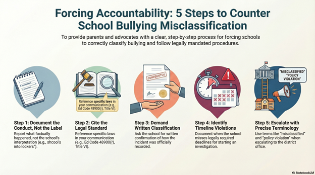 Retaliation is a separate civil rights violation. Parents should document any negative actions following a complaint, such as increased discipline, isolation, grade changes, or exclusion from activities. Retaliation not only violates the law but can significantly strengthen a legal claim against the school.