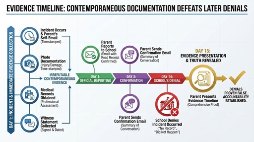 SANI’s counter-strategy is creating undeniable evidence that cannot be gaslit: contemporaneous documentation (email yourself immediately—timestamp proves it), external documentation (medical records, photos, witness statements), forced written responses (send confirmation emails requiring school to correct or confirm), and preservation demands (notify school of duty to preserve evidence, preventing “we lost the records” claims).