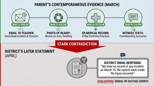 Pattern: Student has visible injuries, medical documentation. District claims: “No injury occurred,” “Student wasn’t hurt,” “Injuries must have happened at home.”
