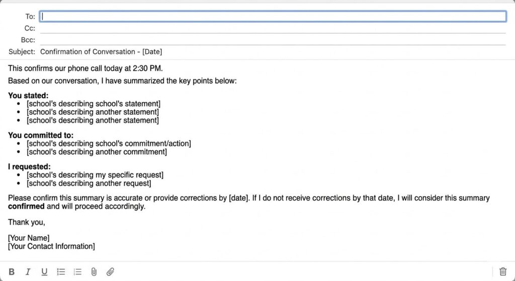 After every phone call or in-person meeting with school staff, send written confirmation: “This confirms our [phone/in-person] conversation today at [time]. You stated: [summary]. You committed to: [actions/timeline]. I requested: [specific requests]. Please confirm this summary is accurate or provide corrections by [date 48 hours out].” If they don’t correct within 48 hours, their silence confirms your account. When they later deny saying something, you have written confirmation they didn’t correct.