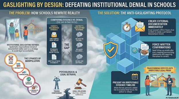 Institutional gaslighting occurs when California school districts systematically deny, minimize, contradict, or rewrite documented incidents of harm despite evidence proving events occurred—not through individual administrator deception but as organizational strategy designed to avoid accountability by making families question their own perception of reality, creating confusion about what actually happened, and eliminating the factual foundation needed for complaints or litigation—manifesting through patterns including: flatly denying incidents parents and students describe in detail (“that never happened,” “we have no record of that”), contradicting eyewitness accounts and physical evidence (claiming “no injury occurred” when medical records document broken bones), asserting different version of events that minimizes harm (“they were just playing” when witnesses describe assault), claiming video footage doesn’t show what families can clearly see, stating policies were followed when documentation proves they weren’t, and insisting families “misunderstood” or “misremembered” events they contemporaneously documented—violations creating what psychologists recognize as institutional betrayal trauma under research by Jennifer Freyd, exacerbating harm when institution responsible for protection becomes source of reality-denial, triggering legal violations including California Government Code Section 815.6 when denials contradict mandatory documentation requirements, Title IX violations when sexual misconduct denied despite evidence under 34 CFR § 106.30 response requirements, spoliation when denials accompanied by destruction of evidence contradicting district’s version, and deliberate indifference under Davis v. Monroe when denying known harassment allows it to continue—defeated when parents create external contemporaneous documentation (timestamped emails to self, photos, medical records, witness statements) that cannot be denied, force schools to explicitly contradict documented evidence in writing (creating proof of bad faith), and present irrefutable evidence timelines in complaints showing district’s denials are demonstrably false.