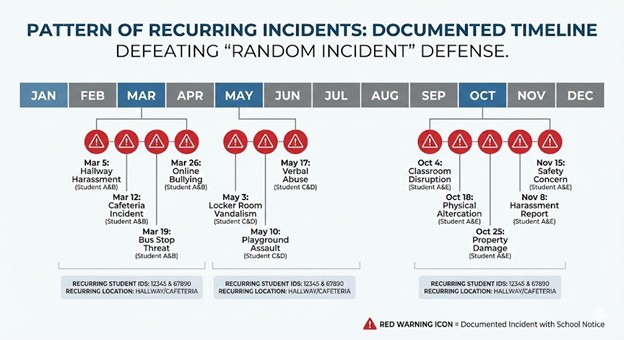 Why Timeline Matters: When a timeline shows multiple incidents in the same location during supervised times (cafeteria, hallways between classes, PE), it proves the school should have known even if parents didn’t report every single incident.
