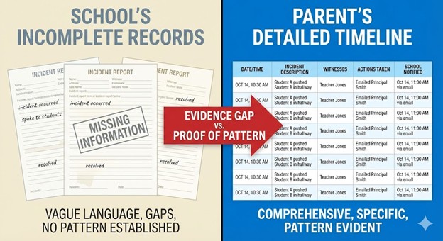 Why Timeline Matters: When the parent’s contemporaneous timeline documents incidents the school later claims “never happened” or “weren’t documented,” it proves the school either failed to document (violating policy) or destroyed records (spoliation).
