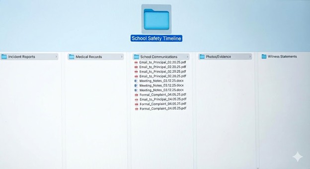 Within 24-48 hours of each incident, gather supporting evidence and attach or reference in the timeline entry: screenshots of texts/emails/social media, photos of injuries or property damage, medical records from doctor visits, school emails or incident reports (if provided), witness statements from other parents or students, audio/video if legally recorded. This corroboration transforms your timeline from “parent’s story” to “documented fact.”