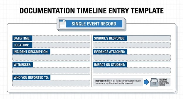 Why Timeline Matters: A timeline showing repeated harassment over weeks or months proves the conduct was persistent and pervasive, meeting the hostile environment standard. It transforms what schools characterize as “a few isolated comments” into documented, ongoing civil rights violations.