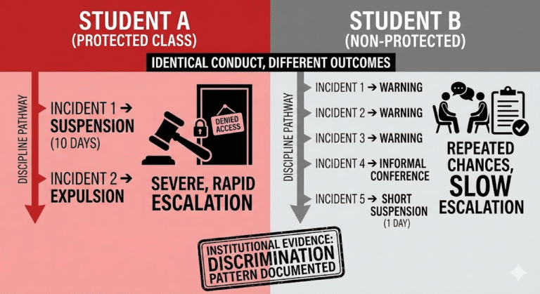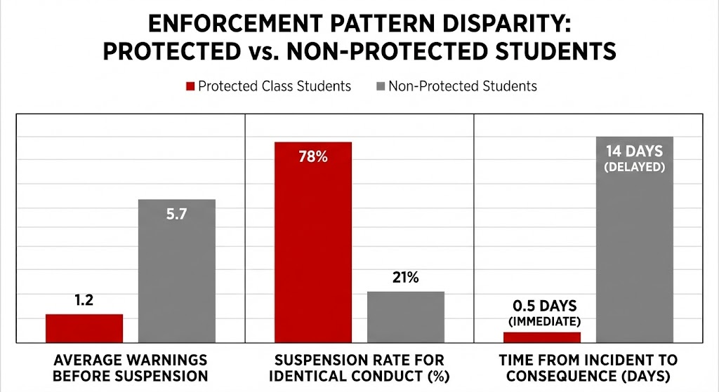 Selective enforcement is not just unfair—it is discrimination. When schools punish some students harshly and quickly while allowing others repeated chances for identical behavior, they violate federal civil rights law. The Student Advocacy Network Institute, a Policy-Driven Student Safety Agency, exists because selective enforcement is the hidden architecture of institutional discrimination in K-12 education. We convert trauma into code by documenting who gets disciplined, for what, how fast, and how severely—then proving the pattern is based on race, disability, or other protected characteristics. Selective enforcement IS discrimination, and enforcement patterns become legal exposure when properly documented. This article teaches parents to recognize, document, and prove selective enforcement as a civil rights violation.