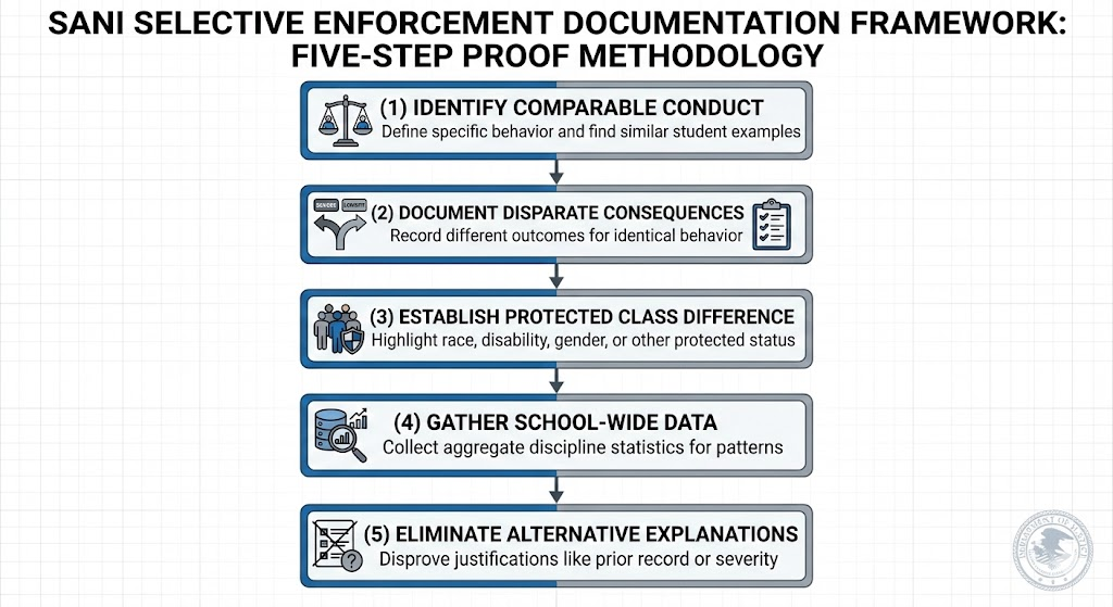 Selective enforcement is proven through comparative evidence, including: (1) similar conduct between students, (2) different disciplinary or safety outcomes, (3) the key distinguishing factor being a protected characteristic, (4) supporting school-wide or historical data showing a pattern, and (5) the school’s inability to provide a legitimate, non-discriminatory justification. Comparative charts and aggregate discipline data are the strongest forms of proof.