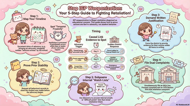 California districts have weaponized the IEP process—transforming what should be collaborative development of student supports into battleground where parents who advocate too effectively, request too many services, or challenge district determinations face swift retaliation disguised as legitimate special education concerns: threat assessments initiated within days of parents requesting safety accommodations, disciplinary escalation immediately following IEP disagreements, emergency removals recommended after parents retain advocates, and systematic exclusion of “difficult” families from school community. We convert trauma into code by documenting temporal proximity between protected advocacy (requesting evaluation, demanding FAPE, filing complaint) and adverse action (threat assessment, discipline increase, removal recommendation), proving causation through timelines showing student had no behavioral issues until parent advocated, then suddenly became “dangerous” or “disruptive” requiring removal. Selective enforcement IS discrimination when California data shows parents of color who request IEP services face retaliation (threat assessments, discipline) at rates 4 times higher than white parents making identical requests, proving districts’ tolerance for advocacy is racially selective—white parents can demand and negotiate, but Black and Latino parents who advocate face pushback disguised as concern for student behavior. This article establishes IEP weaponization as federal civil rights violation creating IDEA procedural safeguard violations, Section 504/ADA retaliation, and disparate impact under Title VI when applied discriminatorily.