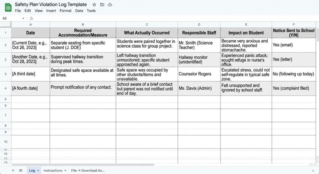 Start log immediately with columns: Date, Required Measure, What Occurred, Responsible Staff, Impact. After each violation, send same-day email: “On [date] at [time], IEP/504/Title IX required [specific measure]. This was not provided: [describe]. Student [impact—was bullied, couldn’t report, etc.]. This is [number] violation. Immediate implementation required per federal law.” Contemporaneous documentation proves pattern, supports enforcement complaints.