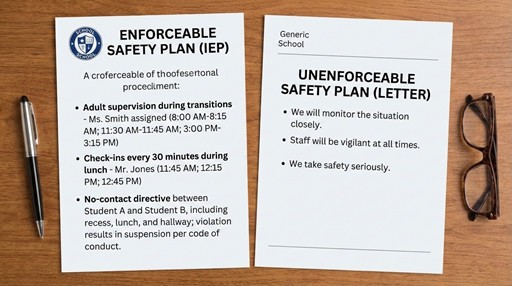 Enforceable safety plans are written into legal frameworks (IEP accommodations under IDEA, 504 accommodations under Section 504, Title IX supportive measures, court orders) creating obligations schools must implement with consequences for violations (due process complaints, OCR investigations, contempt). Verbal promises are unenforceable commitments schools can ignore without legal consequence. Example: "We'll keep an eye on your son" = verbal promise (no specificity, no framework, no enforcement). "IEP Accommodation: Ms. Johnson provides supervision during lunch 11:30-12:00, daily log" = enforceable (specific, in IEP, violations = FAPE denial).