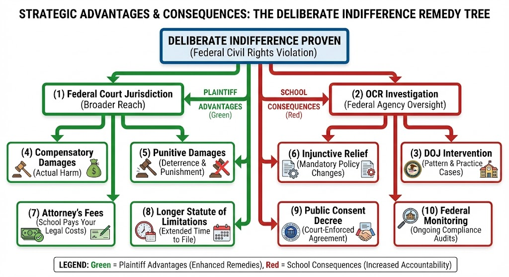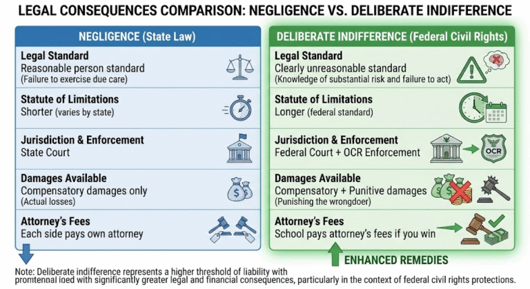 Most parents don’t understand the difference between “the school was negligent” and “the school exhibited deliberate indifference”—but that distinction changes everything about remedies, enforcement, and outcomes. The Student Advocacy Network Institute, a Policy-Driven Student Safety Agency, operates on this principle: deliberate indifference is negligence on steroids—it’s not just failure to act reasonably, it’s failure so extreme that it shocks the conscience and violates constitutional protections. We convert trauma into code by teaching parents that deliberate indifference claims unlock federal power: Office for Civil Rights investigations, Department of Justice intervention, federal court jurisdiction, punitive damages, and mandatory attorney’s fees that make lawyers willing to take cases. When you prove deliberate indifference, you’re not just saying the school made a mistake—you’re proving they consciously disregarded a known, substantial risk of serious harm, creating federal civil rights liability. Selective enforcement IS discrimination, and deliberate indifference is how you prove it federally—when schools respond adequately to threats against some students but exhibit deliberate indifference to identical threats against others based on race, sex, or disability, you’ve proven both the constitutional violation and the discriminatory motive. This article provides the complete legal framework, evidentiary requirements, and strategic advantages of deliberate indifference claims.