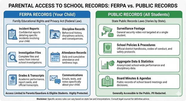 FERPA (Family Educational Rights and Privacy Act) is a federal law granting parents the right to inspect and review all educational records maintained by a school concerning their child, including incident reports, investigation files, discipline records, witness statements (with redactions), and communications between school staff. Schools must comply with inspection requests within 45 days and cannot use “student privacy” to withhold records about your own child. Surveillance footage is generally not an educational record under FERPA but may be accessible under state public records laws, with limitations based on other students’ privacy rights.
