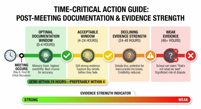 The Post-Meeting Documentation Email is a strategic written record sent within 24 hours of any verbal meeting with school officials that: (1) confirms your understanding of what was discussed, decided, and promised, (2) creates a timestamp proving when the school had notice and what they committed to do, (3) establishes a written record the school must either confirm or correct, and (4) locks down agreements before the school can rewrite the narrative. This email includes six mandatory elements: meeting identification (date, time, attendees), incident/concern recap, school’s acknowledgments and commitments, your requests or demands, specific deadlines and next steps, and a request for written confirmation. Without this follow-up, verbal meetings become “he said, she said” disputes where schools deny promises, change timelines, and claim misunderstandings—with post-meeting documentation, you create undeniable evidence that courts, OCR investigators, and attorneys recognize as proof.