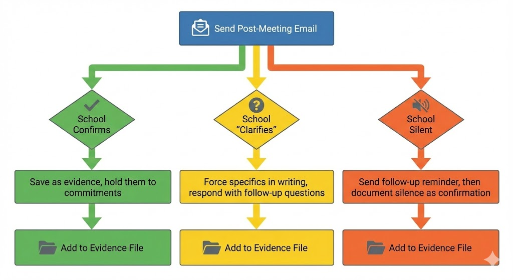 Parent’s evidence: Email sent within 2 hours of meeting, detailing specific commitments, requesting confirmation.