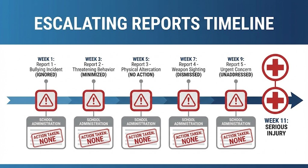 Create a chronological log of every warning, report, complaint, or notification you gave the school about danger. Include: date, time, method (email, phone, in-person), who you spoke with, what you reported, and what response you received. This proves the school had actual notice and cannot claim they didn’t know about the danger.