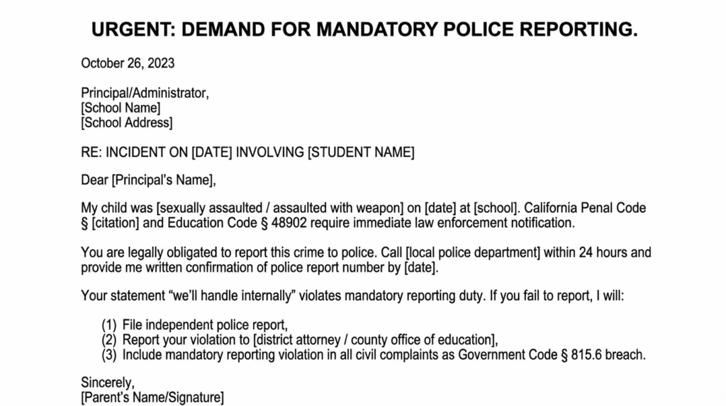 Send demand within 24 hours: “My child was [sexually assaulted / assaulted with weapon / etc.] on [date]. California [Penal Code section] and Education Code § 48902 require immediate police notification. Call police within 24 hours and provide written confirmation of police report number. If you don’t report, I will file independent police report and include your failure to report as mandatory duty violation in all complaints.”