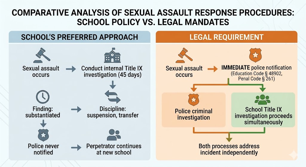 In all complaints (OCR, due process, civil litigation), dedicate section to mandatory reporting violation: “School failed to notify police of [crime] as required by California [statute citations]. This violated mandatory duty creating Government Code § 815.6 liability. School instead conducted internal investigation attempting to avoid police involvement and public scrutiny. Failure to report allowed [continued harm / perpetrator to remain on campus / subsequent incidents]. School prioritized institutional reputation over legal obligations and student safety.”