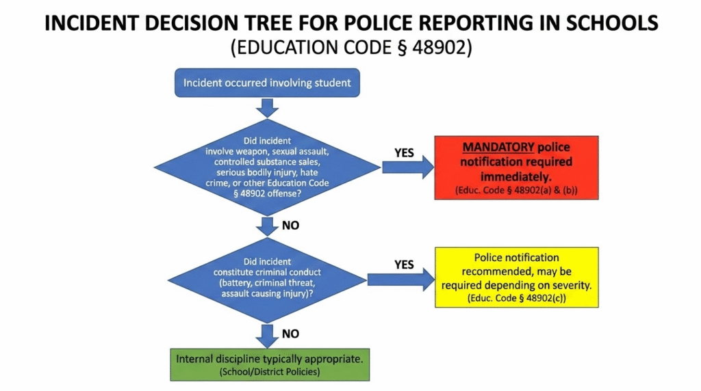 When incident occurs, assess: Does it involve weapon? Sexual assault/contact? Controlled substance sales/distribution? Serious bodily injury? Hate crime elements? Review Education Code § 48902 and Penal Code provisions. If incident falls within mandatory reporting categories, school has NO discretion—must notify police immediately. If school claims will “handle internally,” this violates mandatory duty creating Government Code § 815.6 liability.