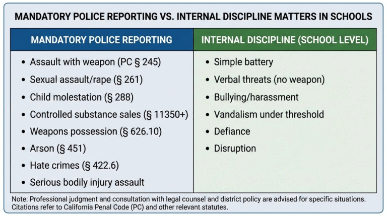 Mandatory police reporting requires California schools immediately notify law enforcement when specific crimes occur on campus or against students—including California Penal Code § 245 assault with deadly weapon, § 261 rape/sexual assault, § 288 child molestation, § 451 arson, § 594 significant vandalism, § 626.10 weapons possession, § 11350+ controlled substance violations, Education Code § 48902 requiring police notification for acts constituting enumerated felonies/misdemeanors—with violations occurring when districts handle reportable crimes solely through internal discipline, delay police notification to conduct internal investigations first, characterize criminal conduct as “peer conflict” or “bullying” to avoid reporting requirements, or pressure families not to file police reports claiming “we’ll handle it internally.”
